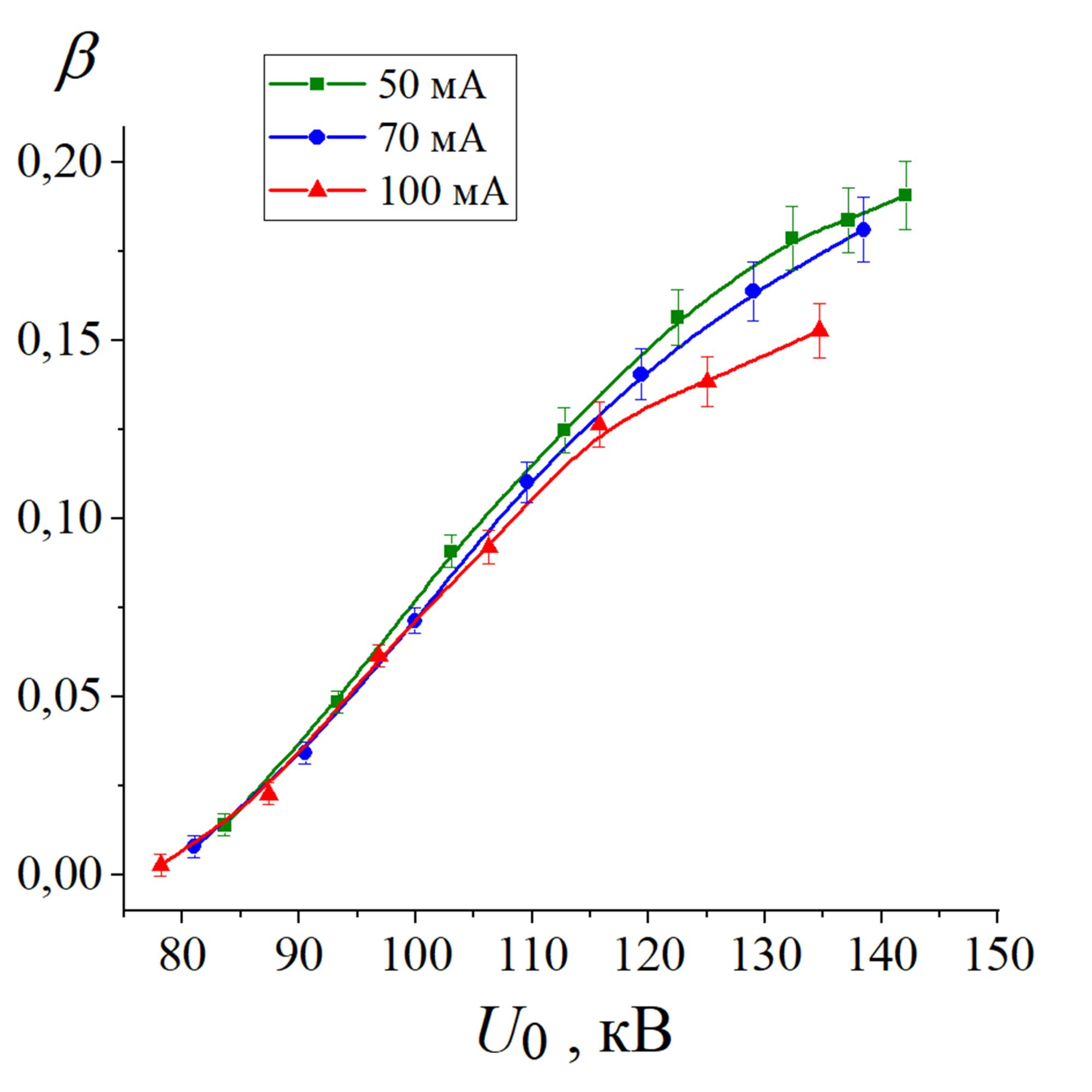 Рис. 1. Зависимость коэффициента вывода тока пучка в атмосферу от ускоряющего напряжения в непрерывном режиме при разном токе вспомогательного разряда